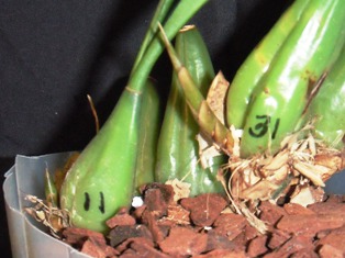 上旬春芽#4 休み 夏芽#21草丈18cmバルブ2x1cm、#5草丈19cmバルブ3x1.8cm #11草丈14cm |
