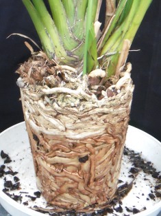 シンビジウムは細い蘭鉢に植えられ、根鉢ができて鉢から抜けにくくなっています。