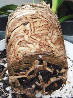 これまでは、植替えは根鉢を崩さず、植込み材料もバークを温存して中央部だけ抜いて発泡スチロールに入れ替える、鉢増しして周りに鹿沼土を入れるなどの方法をとってきました。新苗を完全植え替えして見て、根鉢をほどくのは予想外に簡単なこと、バークが古くなると根腐れすると同時にアリの巣になることなどから、昨年の新苗などを除いては全て新苗と同様に完全に植え替えることにしました。