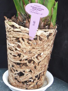 シンビジウムは根がとても丈夫なので、特に浅鉢とする必要はありませんが、洋ラン学園では「底近くに穴のあいたスリット鉢」を使っています。底に穴が無いのが欠点ですがやむをえません。