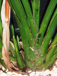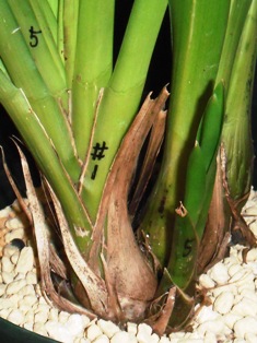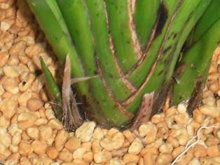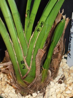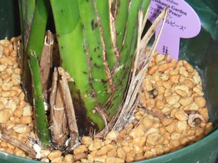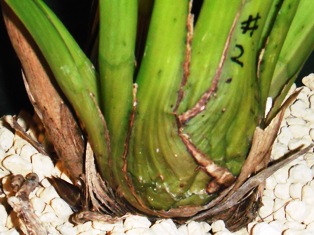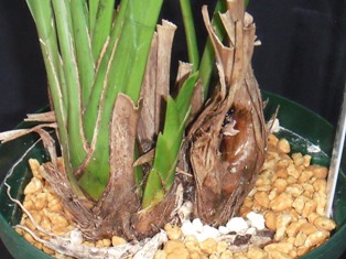 なお、これまで、バルブの両側から脇芽が出ても、「片側が枯れた時の保険」の意味も考えて残してきましたが、「株が小さくなる作落ち」の一因と思われるので、今年は「一律に最初の芽は残し、一つのバルブから2つめ以降の脇芽が出たら全て欠き取る」ことにしました。芽の基はいくつもあるので、最初の芽が運悪く枯れても次に芽が出るようです。