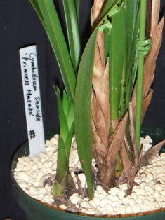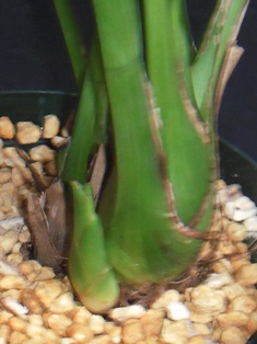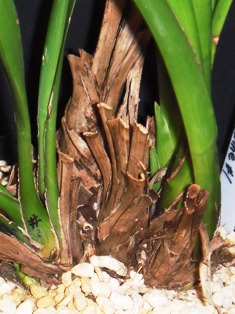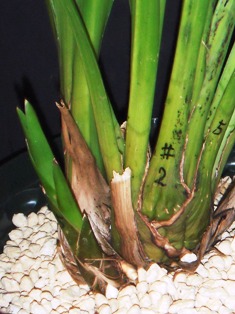 カトレアなどと違って、バルブとバルブは硬くくっついているので、次芽の鋏を入れて切り分けないと、分かれません。