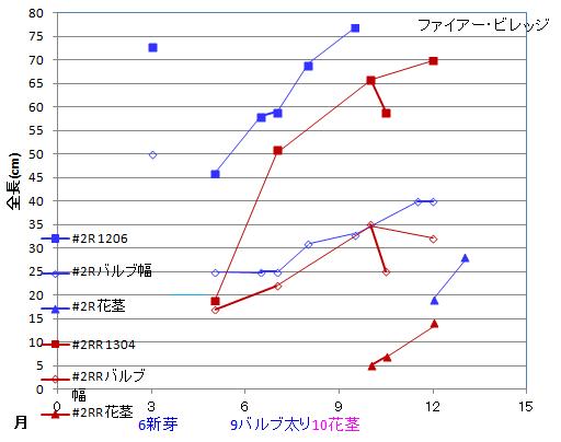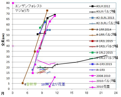 新芽、草丈70cmまで、バルブ幅3.2cm厚さ2.9cmまで、葉12枚まで長さ62cmまで
