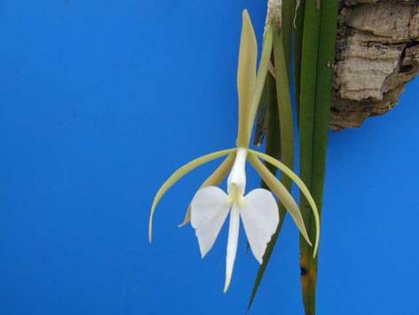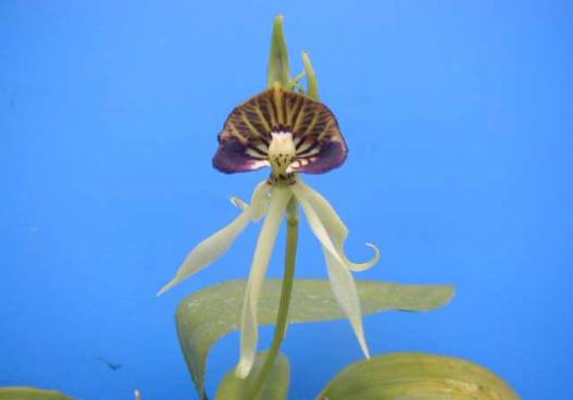 メキシコ高地産。花径 5cm、長さ 7cmもある大きな唇弁、緑と白の花色が特長で、爽やかな感じの花です。(蘭爛、写真も)