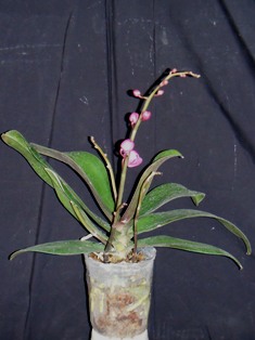 葉の枚数が多く根が元気な有望株を夏に入手して、秋までは直射日光と雨の当たらない屋外で育て、霜の降りる前に室内に取り込み、最低温度を15(洋ラン楽園)-20(洋ラン天国)に保ち、週1回程度水やりしてきました。2月までは気付かなかったのですが、3月後半になったら花茎が伸びていました。