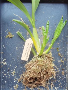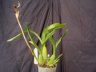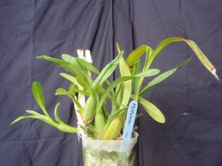 親株草丈27、バルフ7x1.8x0.7cm葉20,15cm開花済 子#1草丈19、バルブ5x1.8x1cm、葉14.5,13cm #2草丈17,バルブ5x1.5x1cm、葉13,13cm非開花 | ||||||||