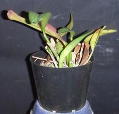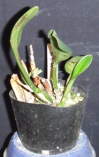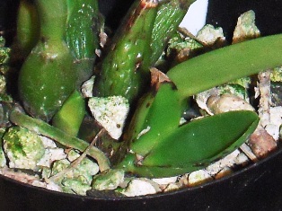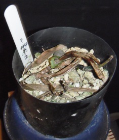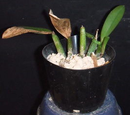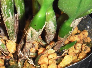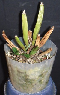 新芽葉のみ、bk遅芽丈1.5x0.4、中:分け株#12-2丈9バルブ内3.5x0.6、右:分け株#12-3新芽丈6.5、根露出