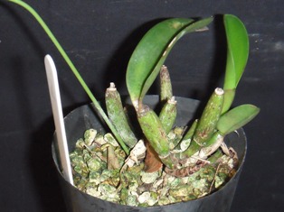 シースなしに蕾が出る(プミラの性質)、葉のない小さなバルブに咲く(ワルケリアーナの性質)yorantaroさんより