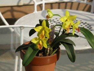 Den. trigonopus (トリゴノプス自生地 インド、ミャンマー、タイ、標高 : 300-1500m。 特徴:草丈15〜20cm。ステムは紡錘状、花は鮮黄色のロウ質、芳香性があり 花期は長い。