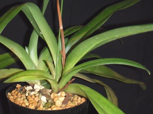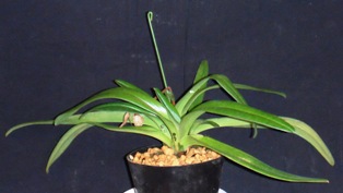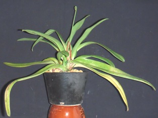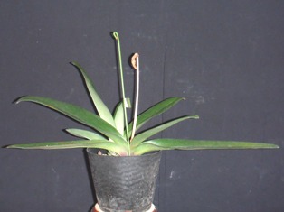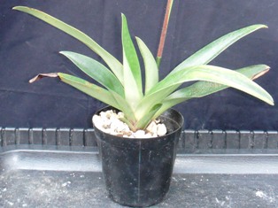 13年1月後半 黒プラ鉢径9cm、二重、丈(最長葉の長さ)19cm、葉4-5枚、葉最広3.5cm、脇芽丈18cm葉5枚
