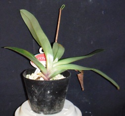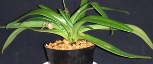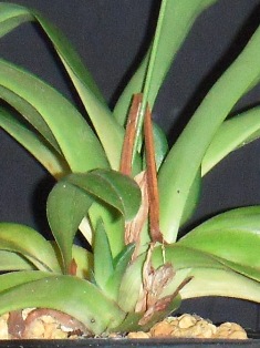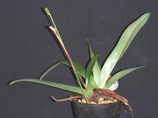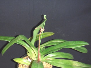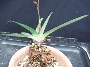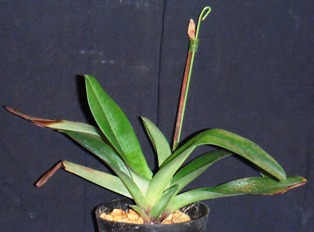 入手後2年近くかかって、そのときすでに葉が5枚で草丈が9cm合った脇芽からようやくシースが出ました。2年の間に葉が4枚出ました。