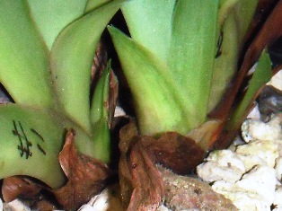 新葉が見えてきました。ロビンフッドは開花株が園芸店に出回るのは冬ですが、年に2回咲き、主に夏咲だそうです。この新葉がシースの出る前触れだと良いのですが。