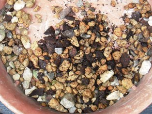 植込み材料は軽石系で鹿沼土または日向土が主なようです。根が発達してポットを押し出しています。根鉢が元気、一回り広い硬質ポリエチレンポットに、底穴が大きいので防虫網を敷きました。