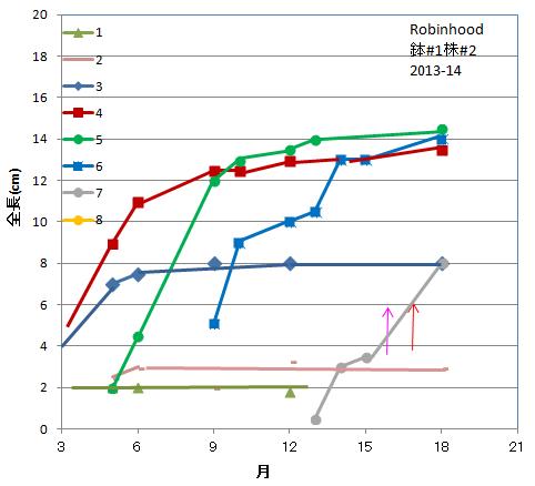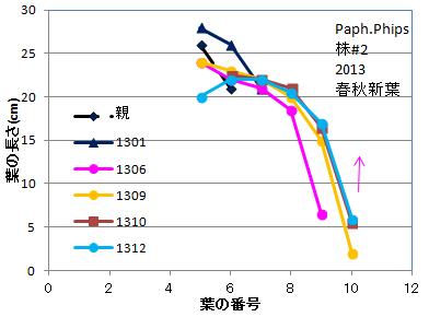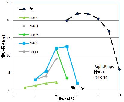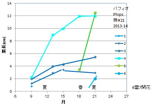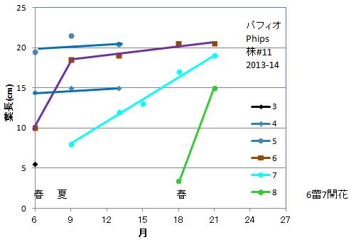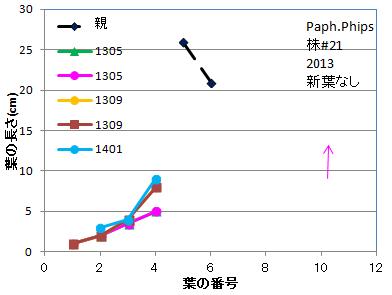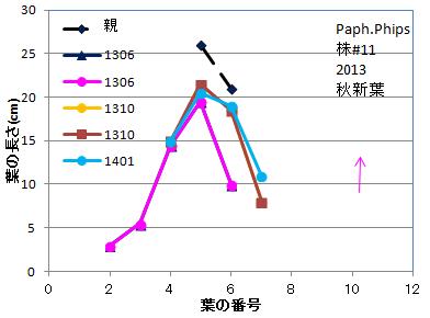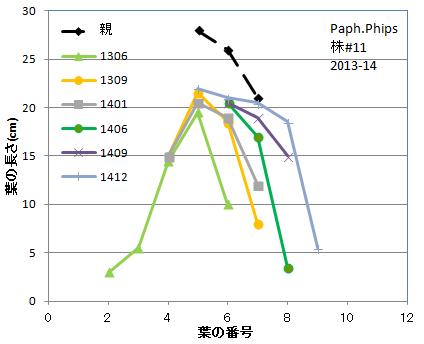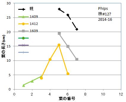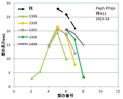 株#12? 以前記録のあった株に記録をつぎ足しました。いつ出た脇芽か分かりませんが、入手時に開花株から出ていてその後咲いた小株に近い、古葉の葉長になっています。