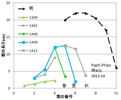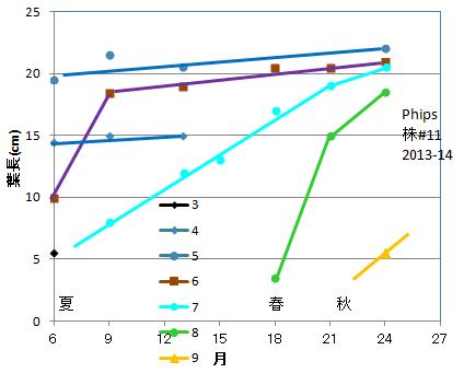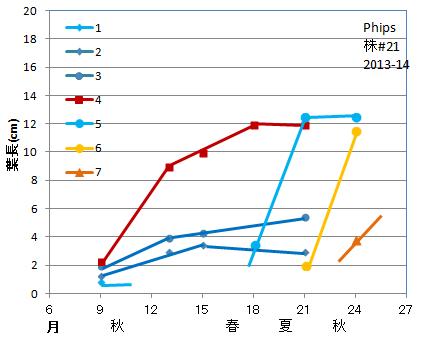各色の折れ線は、時期ごとに、在る葉それぞれの長さを表す点を結んだものです。