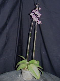 もう一つの代表は、濃桃色の小輪で、花茎をアーチ状に曲げずに上に伸ばして育てられている「満天紅」という種類です。ドリテノプシスというファレノプシスと近縁の強健な種類を片親にして属間交配種のため、強健で、花茎が出やすく良く咲きます。改良された大型種もあります。