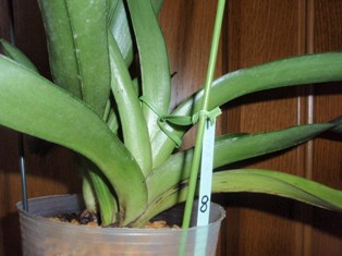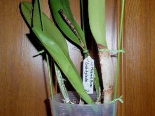 健康な苗で、複茎種では、植え替えに際して、新しい脇芽の根を出しやすくするのが目的です。従って、脇芽の元になっている親バルブを固定するのが最も効果的です。親バルブの先の葉が出ている下のところにビニタイを縛って、支柱に固定します。支柱はバルブや葉を傷めないような位置に立てます。固定位置より上に長くする必要はありません。