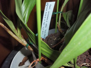 支柱による株の固定の目的は、根を植え込み材料にしっかりと定着させることです。支柱に留めたのに、株が動くようでは意味がありません。株の固定には、ビニタイを使い、アソビを少なくして縛ります。バルブや花茎がある場合は簡単です。太い株には太くてしっかりした支柱を用いた方がぐらつきません。株立ちの場合はなるべく多く留めると良いでしょう。