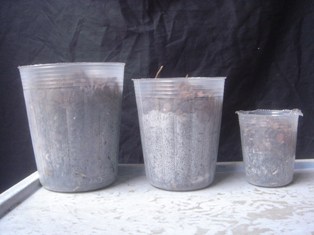径7.5,9,10.5cmの透明ポットと、黒いプラスチック鉢にバークとミズゴケを、また黒いビニールポットにバークを入れて水やりし数日たった処。大きい鉢ほど植え込み材料に湿りが見られる。