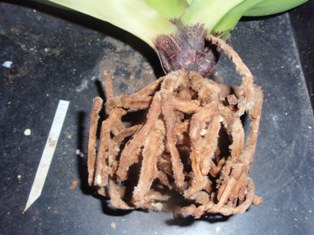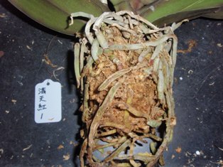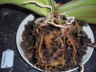 根腐れと言うと、いかにも、育て方が悪くて根腐れしたように思われますが、典型的なコチョウランを初めとして、園芸店の店頭に開花株としてある時に既に根腐れしていることがよくあります。開花した時が最盛期で、すでに衰弱が始まっていることが多いです。
