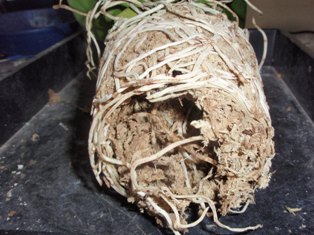 1 ミズゴケ植えを鉢から抜いた処、ミズゴケが鉢の形に固まっている、根は少なく、広い隙間がある。