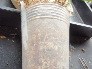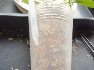 正面に根が露出している 上の隙間からミズゴケ繊維をピンセットで挿入して根に被せる