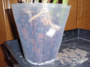 洋ラン学園式芯入り横穴開け透明軟式ポリポットへの植替え