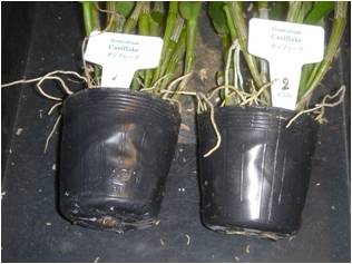 園芸店から開花株を入手して、根腐れしていた例(右)、左は正常な場合