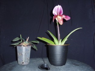 パフィオ:右大きな緑葉系ロビン・フッド、左小さな斑入り葉系マジック・ランタン