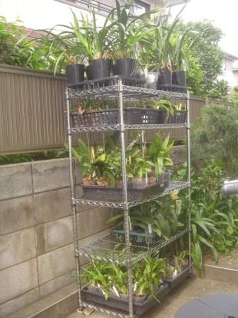 春、屋外に出したばかりは、苗の水分が少ないので、いきなり日向に出すと、日焼けの恐れがあります。落葉樹も葉がなく、日は高くて、適当に日を遮ってくれるものがあまりありません。軒下、ベランダの壁の陰、縁の下、庭の北側などがありますが、日光不測気味になりやすいです。特に日焼けしやすいコチョウランとパフィオは棚の最上段以外に置くのが一つの方法です。