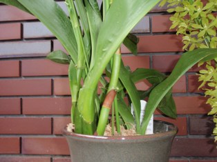 オンシジウムでは、脇芽が大きくなって、晩秋にその横から花茎がでてきます。オンシジウムは枝咲きが多く、花茎が元気に残っていると、新しい枝が出て、気軽にもう一度花を楽しめるのが特長です。また、不定期咲きや二季咲きもあり、夏咲の方が多い位で、咲きにくい場合の原因の一つでもあります。