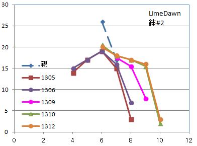 花芽。それらの世代の子は大きさがばらばらで、最大は#E1で丈26cm太さ0.9cm葉は9枚。