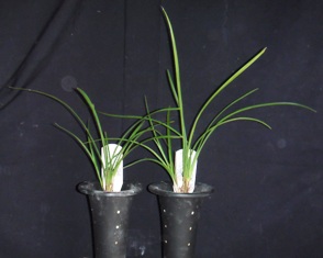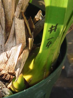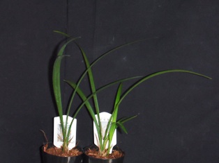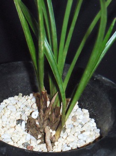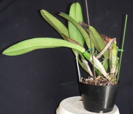 花芽分化の基準とされる、葉の枚数4枚は十分ですが、葉長40cm、葉幅1.5cmには、バックバルブ(一度冷害で枯れて春遅くに改めて出たもの、葉長30cm前後、葉幅1.3cm前後)でさえ冷害で作落ちして足りていません。