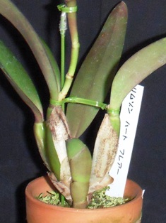 3+ カトレヤ原種 アメジストグロッサの蕾が枯れたシースから出てきました。