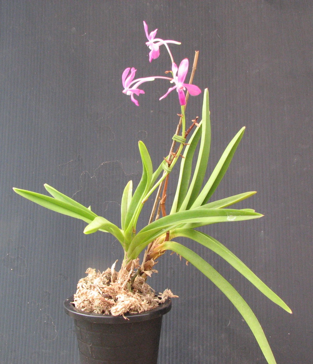 バンダは小型のランで、単茎性で根も弱い為バスケット作りが勧められています。ここでは、小さな鉢に隙間を多くして水苔主体で植えられている苗を育ててみます。青色の網目模様の花が代表的ですが、ここでは赤花・夏咲きの例です。