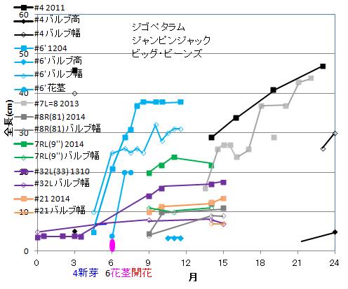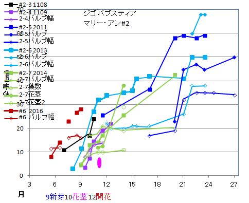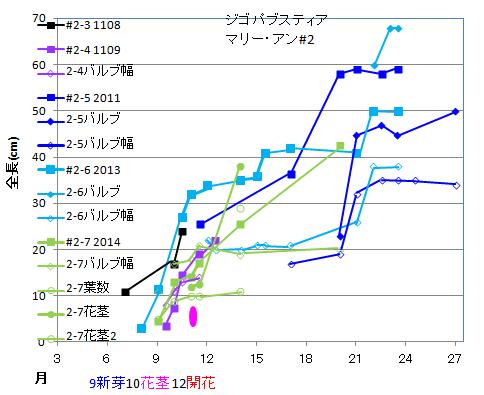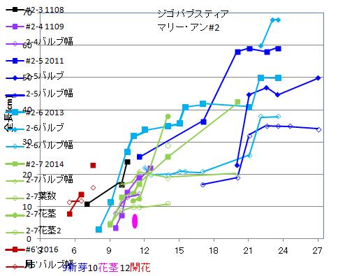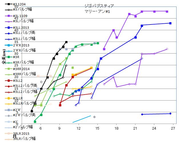 | 株# | 年月日 | 丈 | バルブ長 | 幅 | 厚 | 葉数 | 葉長 | 幅 | 花茎 | 蕾 | 花 |