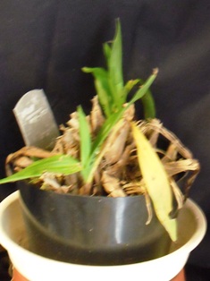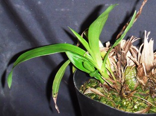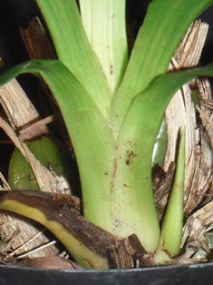 冬新芽が出てきました。親株はバルブができていなくて細いため、新芽は体に沿っています。